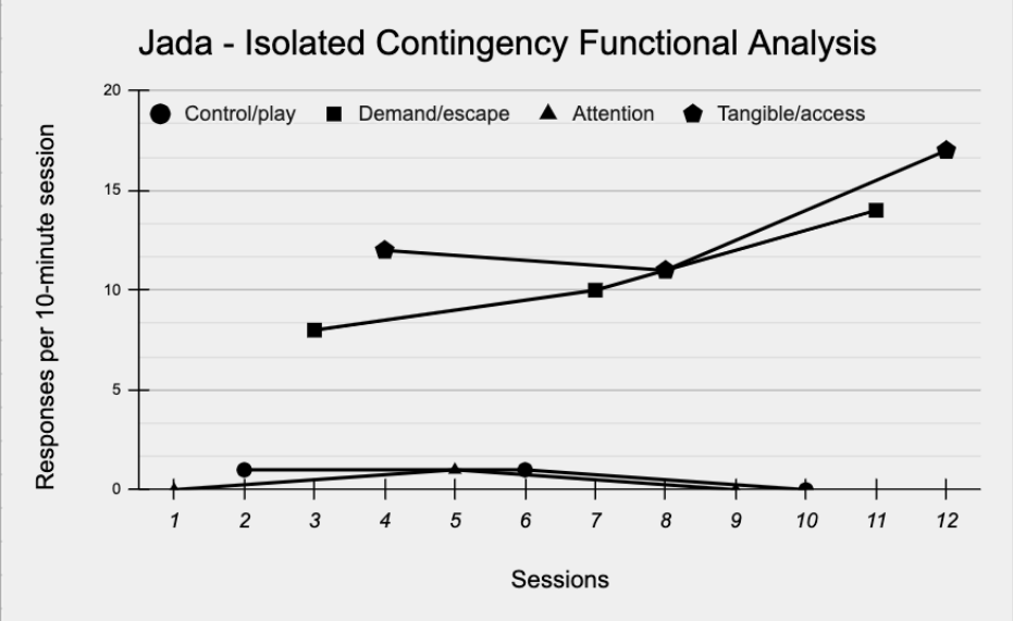 Based on the results of the indirect (record reviews, interviews) and descriptive assessments, Ms. Bailey decides that the following functional analysis conditions will be conducted: demand/escape + access to tangible, and a control condition. These conditions are based on the previous assessments, and are part of a synthesized contingency analysis. As a scientist practitioner, Ms. Bailey remains ready to design further conditions, isolate contingencies, or change her assessment direction based on findings.
